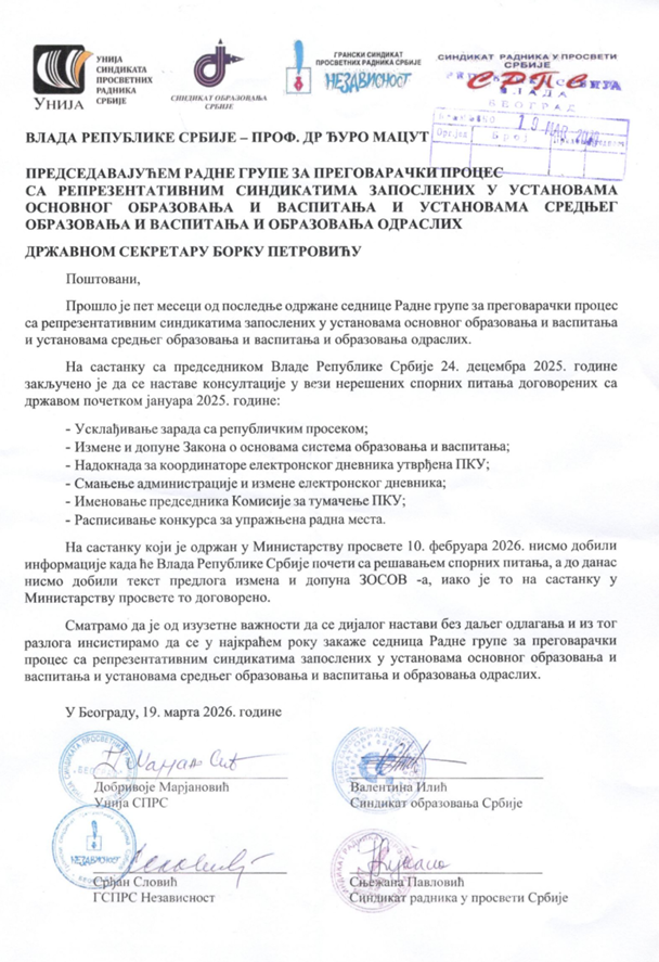 РЕПРЕЗЕНТАТИВНИ СИНДИКАТИ УПУТИЛИ ДОПИС МИНИСТАРСТВУ ПРОСВЕТЕ У ВЕЗИ СА ПРИМЕНОМ ПРОЈЕКТА “ЗДРАВИТАС”